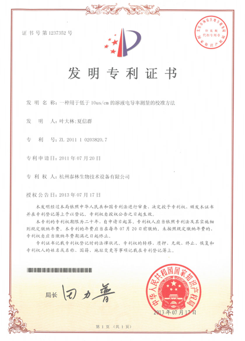 一種用于低于10us/cm的涫寢電導(dǎo)率測(cè)量的校準(zhǔn)方法ZL 2011 1 0203820.7 -